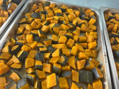 今日の「焼きかぼちゃ」のかぼちゃは、北海道産のものでした。塩で下味をつけて焼き物機で焼いています。とても甘みがあり、おいしかったです。