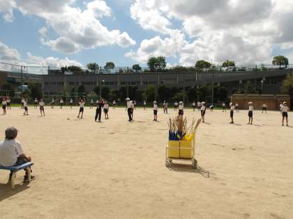 運動場に出て、演技の場所確認を行っています。