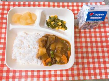 【ハヤシライス、グリーンアスパラガスとコーンのサラダ、洋なし(缶づめ)、牛乳】