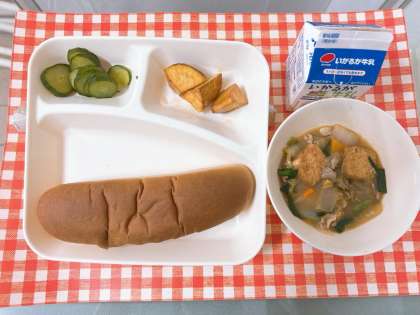【中華煮、大学いも、あっさりきゅうり、黒糖パン、牛乳】