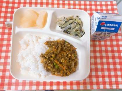 【大豆入りキーマカレーライス、キャベツのひじきドレッシング、和なし(缶づめ)、牛乳】