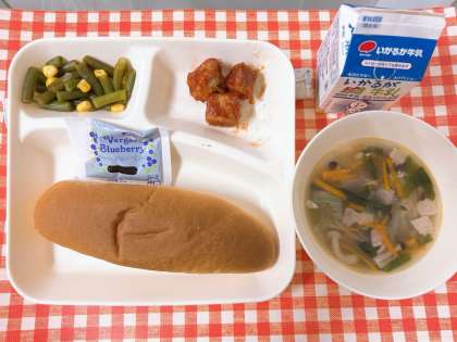 【まぐろのオーロラ煮、スープ、さんどまめとコーンのサラダ、コッペパン、ブルーベリージャム、牛乳】