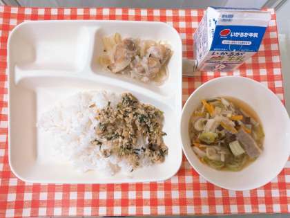 【鶏肉のゆず塩焼き、ソーキ汁、ツナ大豆そぼろ、ごはん、牛乳】