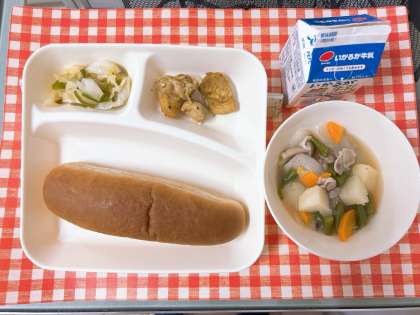 【鶏肉のカレー風味焼き、スープ煮、野菜のソテー、黒糖パン、牛乳】