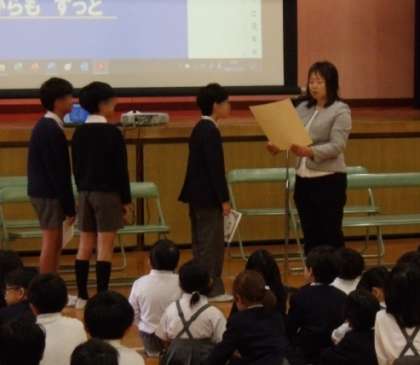 代表の児童からお礼の言葉をお伝えし、感謝の気持ちを込めて手紙をお渡しし、全児童で歌のプレゼントもしました。