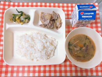 【豚肉のしょうが焼き、さつまいものみそ汁、きくなとはくさいのごまあえ、ごはん、牛乳】