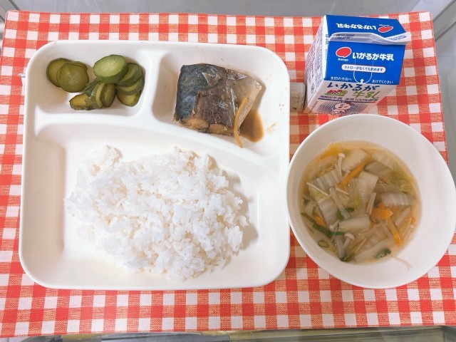 【さばのみそ煮、五目汁、きゅうりの甘酢づけ、ごはん、牛乳】