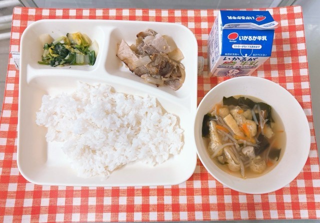 【豚肉のスタミナ焼き、五目汁、きくなとはくさいのおひたし、ごはん、牛乳】