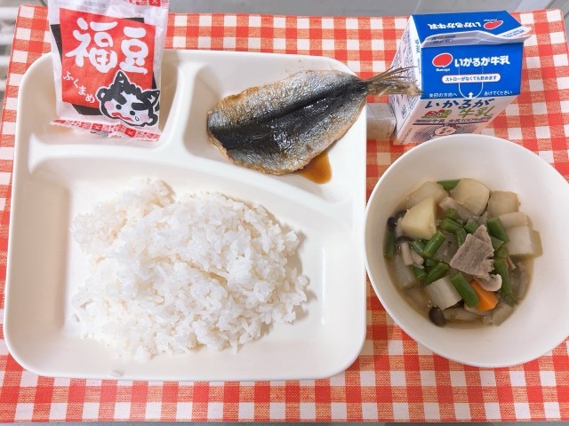 【いわしのしょうがじょうゆかけ、含め煮、いり大豆、ごはん、牛乳】