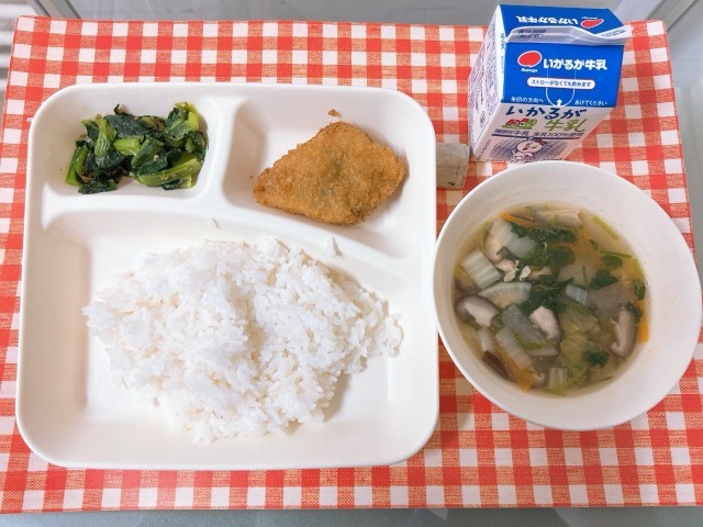 【たらフライ、うすくず汁、こまつなのごまあえ、ごはん、牛乳】