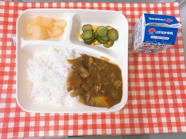 【チキンレバーカレーライス、きゅうりとコーンのサラダ、洋なし(缶づめ)、牛乳】