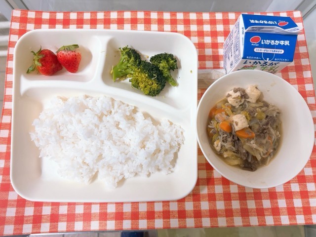 【すき焼き煮、ブロッコリーのしょうがづけ、いちご、ごはん、牛乳】