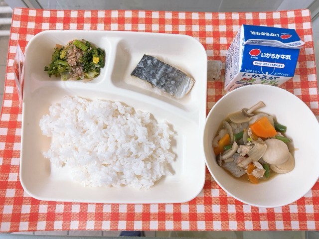 【さごしの塩こうじだれかけ、さといもの野菜の含め煮、なのはなのおひたし、ごはん、牛乳】