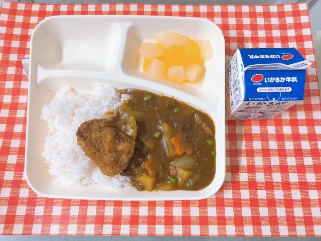 【カツカレーライス(米粉カツ)、フルーツゼリー、牛乳】