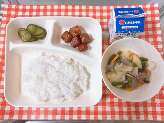 【まぐろのオーロラ煮、豚肉と野菜の煮もの、きゅうりのゆず風味、ごはん、牛乳】