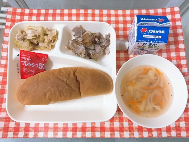 【豚肉のガーリック焼き、スープ、ツナとキャベツのソテー、コッペパン、いちごジャム、牛乳】