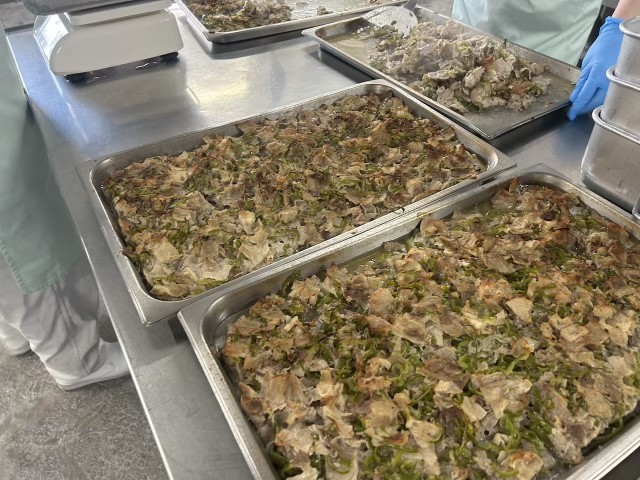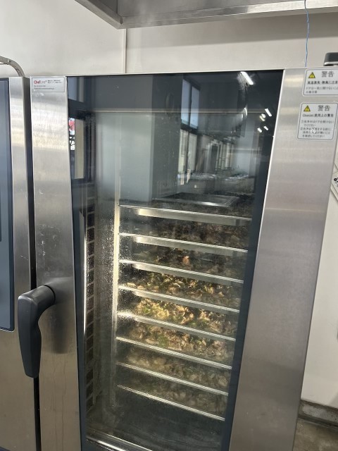 写真は、「豚肉のガーリック焼き」を焼き物機で焼いている場面と、配缶している場面です。