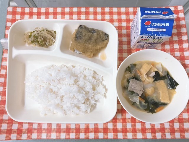 【さごしのおろしじょうゆかけ、みそ汁、もやしとピーマンのいためもの、ごはん、牛乳】