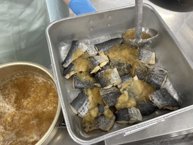 「さごしのおろしじょうゆかけ」は、焼き物機で焼いたさごしに、大根おろし、みりん、しょうゆで作ったタレをかけています。小学校の給食は、魚の切り身を焼いたメニューが多くあります。おはしできれいに食べられるようになっていきます。
