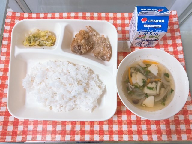 【鶏肉のたつたあげ、五目汁、キャベツの梅風味、ごはん、牛乳】