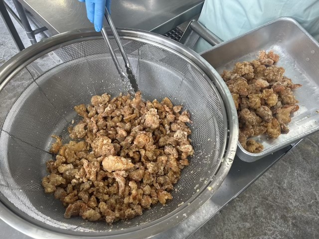 子どもたちにとても人気のある「鶏肉のたつたあげ」です。鶏肉にしょうが汁、料理酒、しょうゆで下味をつけて、でん粉で衣をつけて油で揚げています。