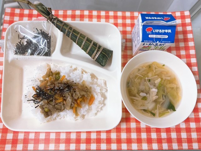 【きんぴらちらし(きざみのり)、五目汁、ちまき、牛乳】
