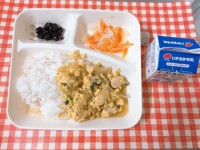 【冬野菜のカレーライス、ブロッコリーとコーンのサラダ、和なし(缶づめ)、牛乳】 ...