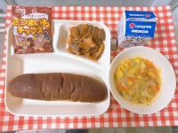 【とうふのミートグラタン、じゃがいもと野菜のスープ、はっさく、黒糖パン、牛乳】 ...