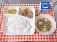【鶏肉のたつたあげ、五目汁、キャベツの梅風味、ごはん、牛乳】 子どもたちにとても...