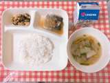 【さごしのおろしじょうゆかけ、さといものすまし汁、大豆の煮もの、ごはん、牛乳】 ...