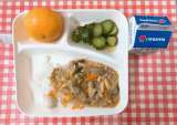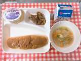 【豚肉のデミグラスソース、スープ、ぶどうゼリー、おさつパン、牛乳】 「豚肉の...