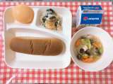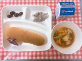 【スープ煮、ほうれんそうのグラタン、白桃(缶)、黒糖パン、牛乳】 「スープ煮...