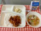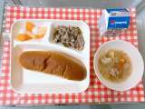 【豚肉と野菜のソテー、はくさいのスープ、フルーツ白玉、黒糖パン、牛乳】 「豚...