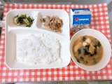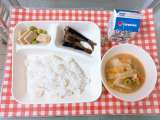 【豚肉のねぎじょうゆ焼き、みそ汁、きくなとはくさいのごまあえ、ごはん、牛乳】 ...