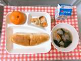 【さけのマリネ、肉だんごと麦のスープ、みかん、おさつパン、牛乳】 「さけのマ...