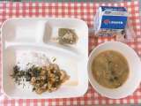 【かやくご飯、じゃがいものみそ汁、まっ茶ういろう、牛乳】 新茶の季節に合わせ...