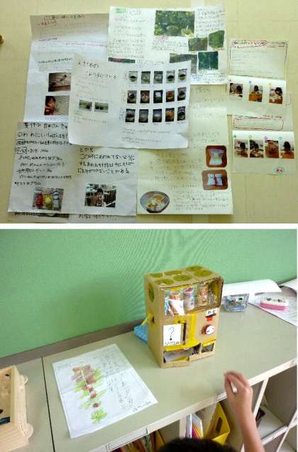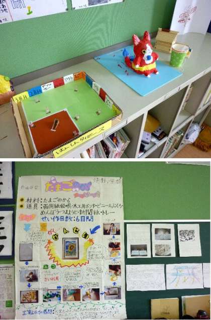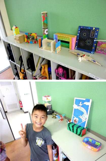 各学級の教室には、夏休みの自由研究の作品や研究資料が掲示されています。いろいろな観点の研究や作品があり、とても楽しいです。力作がそろっています。