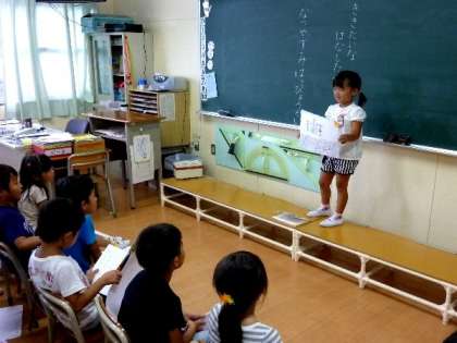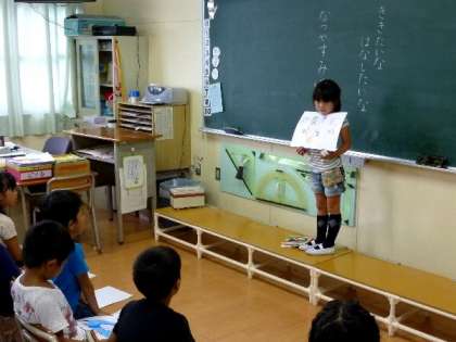 1年生の国語で、「ききたいな はなはたいな」を学習しています。なつやすみの楽しかったことなどを、文や絵にまとめて、発表しています。しっかり大きな声で発表できたかな。