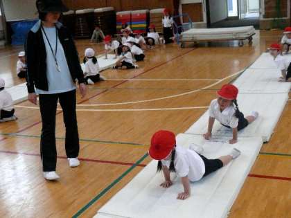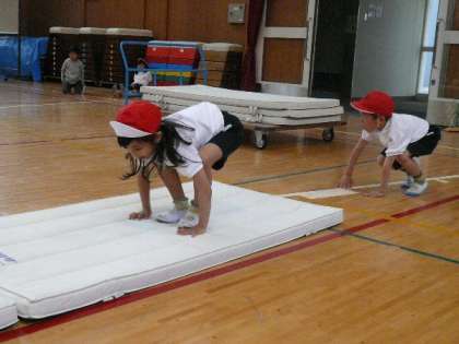 1年生の体育で、前回のゆりかごの運動からむずかしい運動になってきました。今日は、マットでカエルとびをして、途中からは腕だけで前進していきます。遊びながら、少しずつ体力をつけていくようにしています。