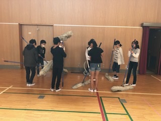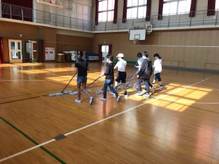 体育の活動をよりよくするため、場の環境を整えていきます。委員会の活動のひとつである講堂の清掃活動の様子です。子どもたちはやる気と自主性をもって活動してくれています。