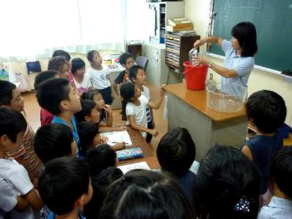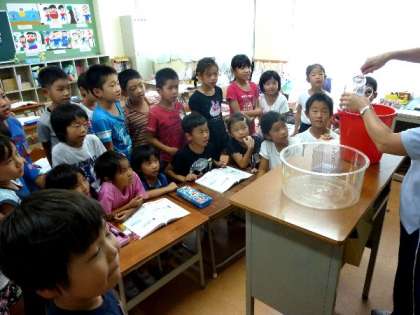 2年生の算数では、1デシリットル、1リットルを学習しています。水槽をつかって、実際のかさをはかって確認しています。子どもたちから「ほんまや!」と先生の実験に集中しています。楽しみながらしっかりと学習できています。