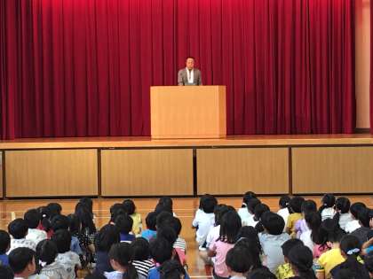 今日は鶴見区役所から、地域の安全を見守っている職員の方が来てくださり、日ごろの安全確認の大切さや、知らない人についていかないことを教えてくださいました。また、校長先生からは、「いじめを考える日」でもあり、いじめについてみんなで考えるお話がありました。