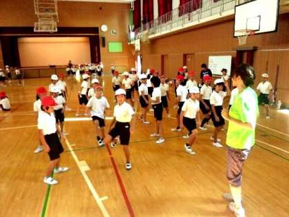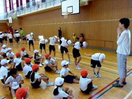 3・4年生の運動会ダンスは、細かいきめポーズなど、少しむずかしいですね。先生方も個別にポイントを指導しています。