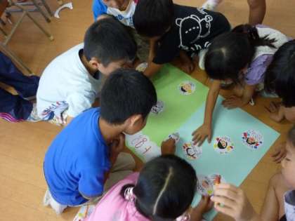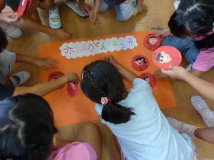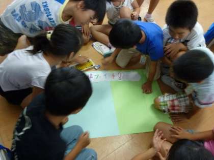 2年生が応援旗をつくっています。「赤組がんばるぞ」「白組ファイト!」でバッチリだ。