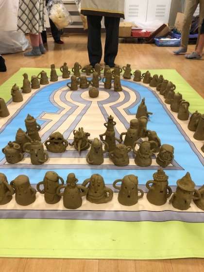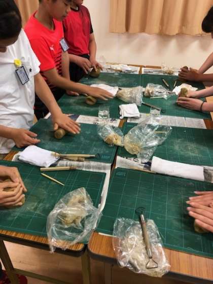 本日3・4時間目、大阪府立近つ飛鳥博物館から講師を招いて『はにわづくり』をしました。学習の前半は古墳時代の学習をしました。古墳から出土されたものから当時の生活の様子がわかることを詳しく教えてもらいました。学習の後半は、『はにわづくり』です。つくり方を教えてもらい、一人一人が思い思いの埴輪をつくっていました。