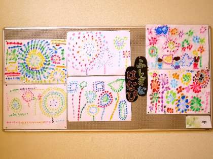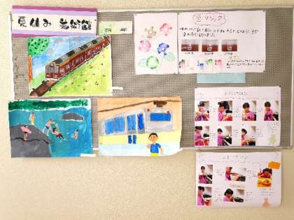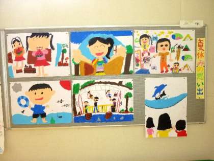 各学年の掲示版です。夏休みの自由研究などが掲示されています。