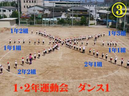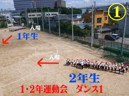 1・2年生のダンスの配置です。ダンスはふたつあります。1年と2年が別々入場して各学級ごとに輪になります。そして、曲の1番目がおわって移動します。米印になります。お子さんがどこにいるか聞いてみてください。写真・ビデオポイントをのがさずに応援していただければ幸いです。