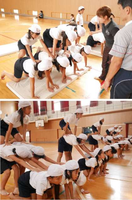 5・6年生の組み立て体操は、二人くみから、三人ぐみ、五人ぐみへと進み、だんだん大人数での大技になっていきます。慎重に場所や、バランスを考えて練習しています。