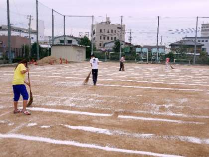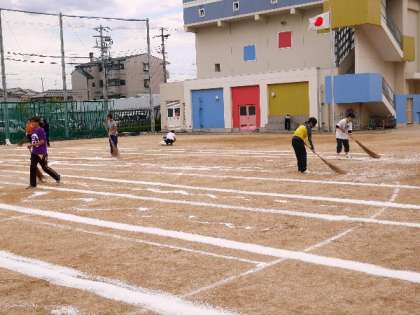 運動会まで、あと二週間です。来週からは全体練習がはじまります。運動場での練習もおおくなります。運動場の土ほこりを軽減するために、先生がたで、運動場に「にがり」をまきました。
