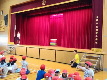 全児童が集合して、集会委員会が考えたクイズ「間に通るものな〜んだ」をたて割り班単位で考えて、答えをホワイトボードに書いて正解を競うゲームをしました。さて、今、何が幕の間を通っているでしょう?